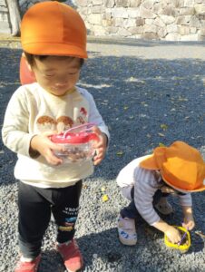 それぞれの入れ物に小石やどんぐりをたくさん集めていたひまわり組さんでした。