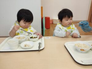いちご組さんでは、今日、初めての離乳食を食べたお友だちがいましたが、