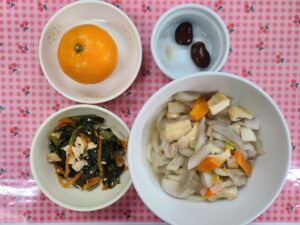 「しっぽくうどん・小松菜のけんちゃん・しょうゆ豆・みかん」でした。