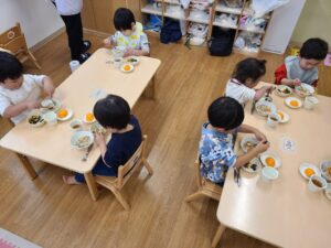 けんちゃんは、本来は小松菜ではなく、万葉(まんば)という野菜を使ったメニューが定番ですが、独特のアクがあるので、園では小松菜で代用して作りました😊けんちゃんという語源には、豆腐と野菜を油で炒めた精進料理の「けんちん」からきていると言われているそうです(#^^#)