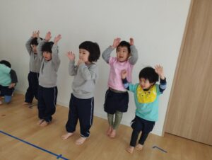 3歳児さんは、いろんな動物になって体を動かしたり、縄を跳んだりしましたよ🐸