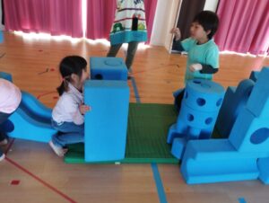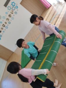 5歳児さんは、大繩を使って綱引きをしたり、大型のウレタンブロックを使ってみんなで「お化け屋敷」を作ることを決めて作りましたよ。自分から友だちと協力する場面もみられ、さすが年長さんでした✨