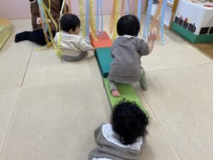 今日は、お部屋で、スズランテープのトンネルで遊びました。ずりばいでくぐったり、テープを触ったりして、興味津々でしたよ😊