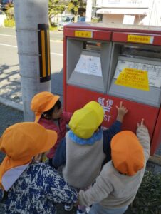 ひまわり組さんも年賀状を出しに行きました。みんなよりも大きいポストに興味津々です。