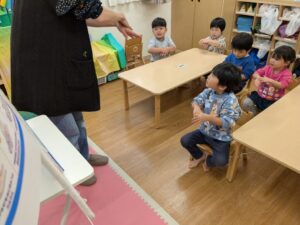 めろん組さんは、手洗い・うがいのお話しを聞きました。真剣な眼差しで、保育者の真似をしていたようです。