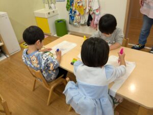 色々な色を使って描く子もいれば、お気に入りの1色で仕上げる子もいましたよ♪