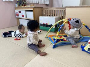 お部屋の中ではプレイジムやボールなど、興味のある物に手をのばして遊びました♪♪
