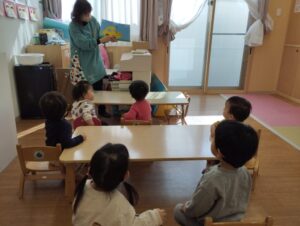朝のおやつは、動物のビスケットでした。「先生これ何?」と聞きながら食べていました。