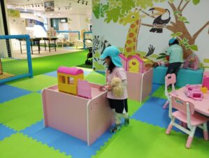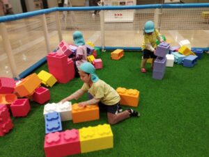 大型ブロックに、ドレスに着替えたり警察官に変身したりして撮影できるセルフ写真館、ままごと、遊具コーナー、ボールプールなど友だちと一緒に楽しそうに遊んでいました。