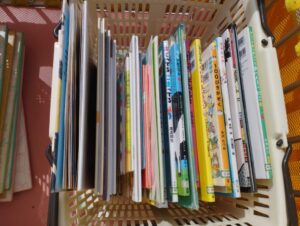 毎回100冊近く借りる子どもたち!今回も散歩車の中を覗いてみると、たくさんの絵本や紙芝居を借りていました!!
