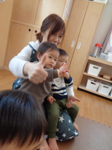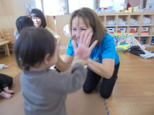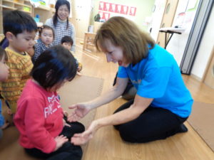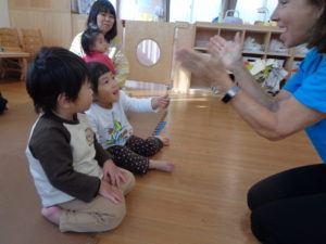 「Hello~ Hello~ Hello、How are you?」小さいおともだちも手で「How are you」と上手に出来ていますね(*´▽`*)