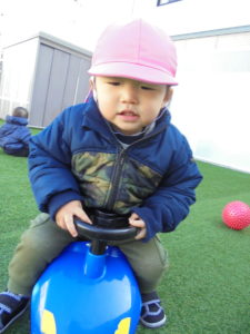 いちご組さんは園庭で車に乗ったり、かけっこしたり、ボール投げしたり。思いっきり体を動かして遊びました。最近歩き始めたおともだち、靴を履いても、上手に芝生の上を歩けていますよ!すごいですね( ゚Д゚)