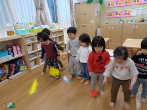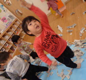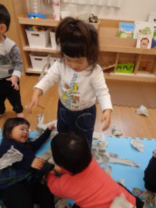 お布団に見立てて寝転がったり、上から降らせたりしてそれぞれ楽しんでいました(*^-^*)