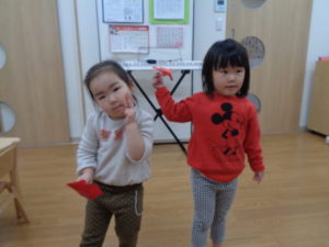 めろん組はお絵かきをした後、先生と一緒に作った紙ヒコーキを飛ばしていました🛫