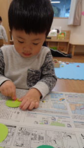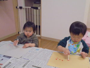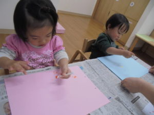 いちご組は足型をとったり、綿棒でスタンプをしたりして製作をしました。