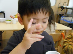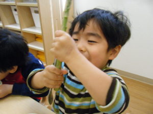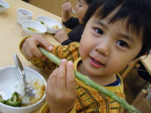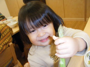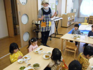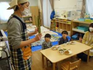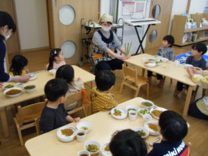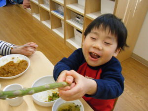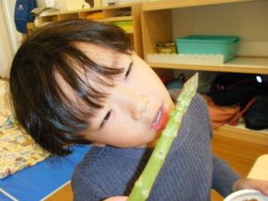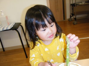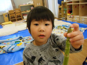 アスパラを見せ、このお野菜の名前が分かる人~~??と聞くとほとんどのお友だちが「アスパラ!!」と大きな声で答えてくれました!