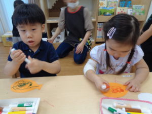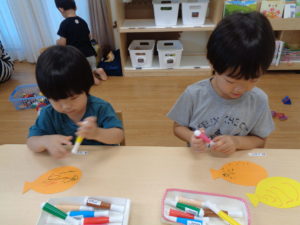 お魚の模様をにじみ絵を使って表現しました。まずは、好きな模様をマジックで描いて、その上に水を含ませた筆を塗り、にじみ絵の完成!!
