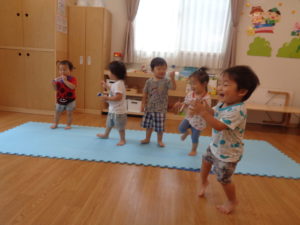 大好きな手作りマラカスで音楽に合わせて遊びました。サンバの曲に合わせて、シャカシャカシャカとマラカスを嬉しそうに振っていました。