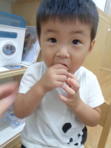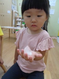 かき氷の製作をしました。製作をする前に、氷からかき氷ができることを知ってもらうために、子どもたちには氷を触ってもらいました。氷がおいしそうで食べたくなる子も(^^♪