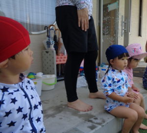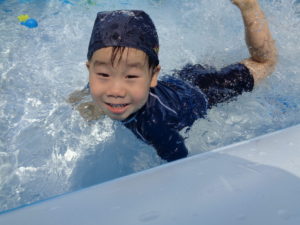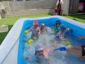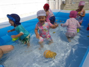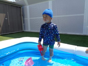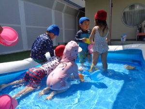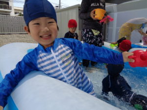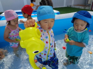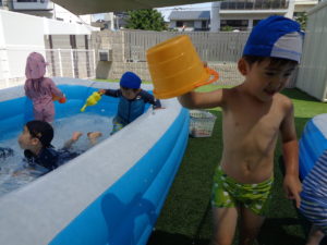 プールの中ではお水をすくって体にかけたり、お友だちとお水をいれあいっこをしたりしていましたよ😉