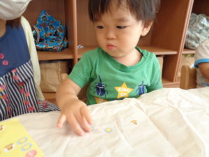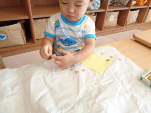 シールののり部分が指につくと、一生懸命はがします。