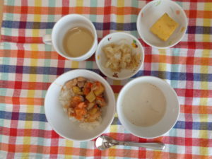 今日の給食のメニューはキャベツともやしの煮びたし、豆乳スープ、豚肉とさつま芋の旨煮丼、バナナでした。