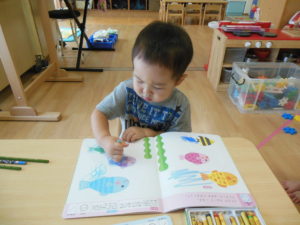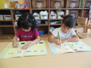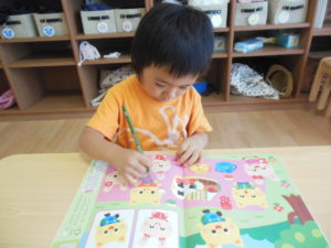 タンバリン組さんはお部屋でワークを熱心に取り組んだ後ブロック遊びをしました。