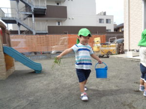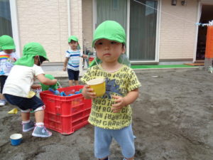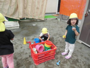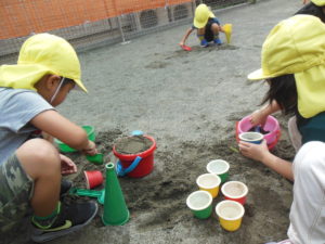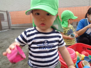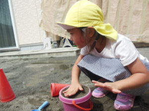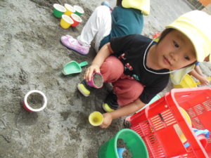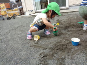 シャベルをしっかり握り、上手に砂をすくえるようになり手の力がついてきましたね!