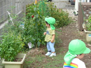 トマトやパプリカが実っていて興味津々💛ちょっと触ってみてました!