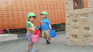 バケツに砂を入れて歩いたり、山を作って楽しみました。