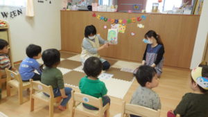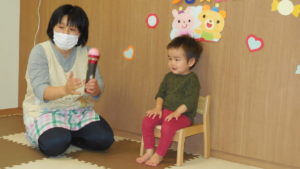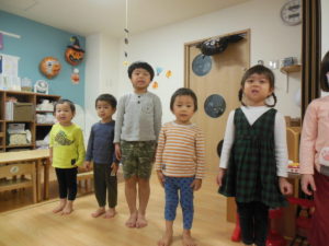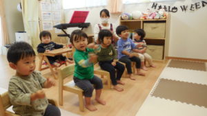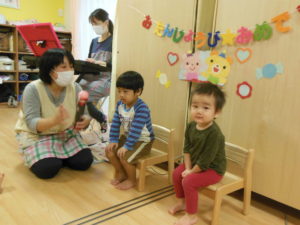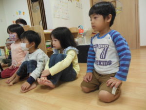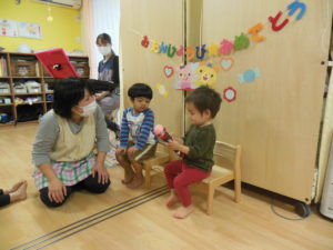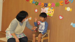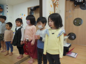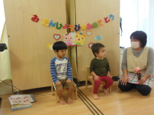 はじめはカスタネット組さんとスズ組さんにお祝いしてもらいました。お誕生児さん、少し