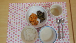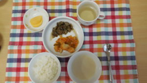 今日の給食のメニューは、ご飯、カジキのケチャップ煮、なすとオクラの炒め煮、コーンスープ、