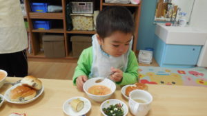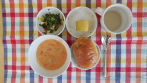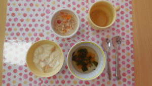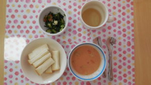 パンがゆ・鶏肉とやさいのトマトミルク煮・スープ(ほうれん草、トマト)