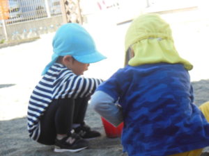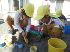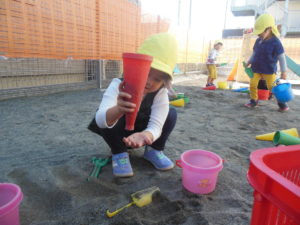砂場でバケツやカップに砂を入れたり