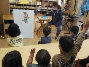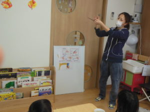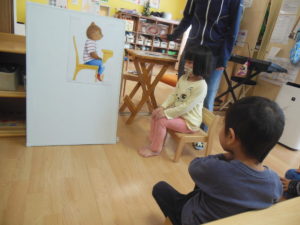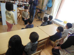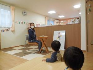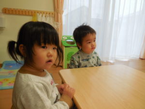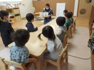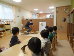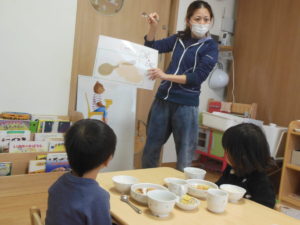 タンバリン組さん・ピアノ組さんは、製作をした後、「食具・正しい姿勢」についてのお話に参加しました。