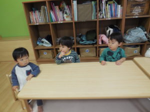 カスタネット組さんです。つかまり立ちをして、歩く練習をしました。