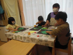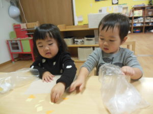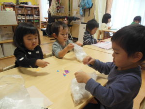 タンバリン組さんは、お花紙を丸め、カットした色画用紙と一緒に、袋に入れました。