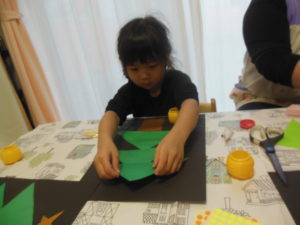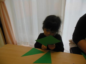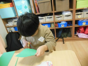 ピアノ組さんは、ハサミを使い、画用紙を直線に切りました。