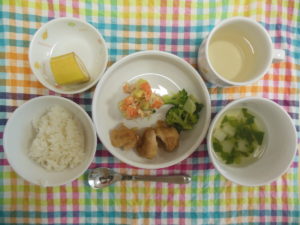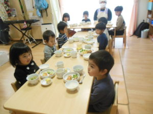 姿勢のお話を聞いた後、背筋を伸ばし、足を閉じて格好よく給食を食べました。