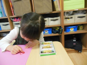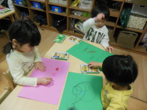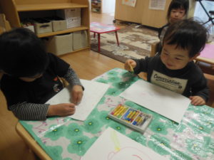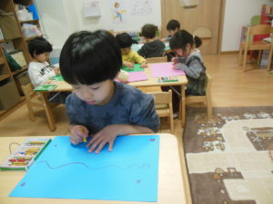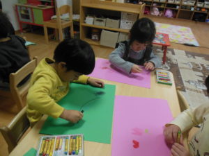 大きいクラスのお友達はお店屋さんごっこに使うカバンの製作で、色画用紙に思い思いに