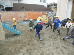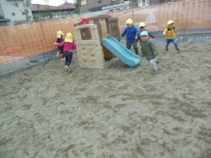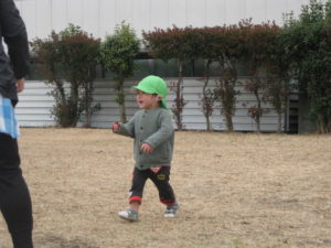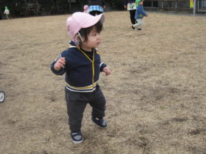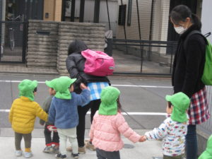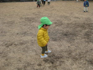 今日は朝から曇りがちの天気で、気温も低めでしたが体を動かして遊ぶ為、カスタネット組さんとスズ組さんは、新畑子ども広場までお散歩に行きました。