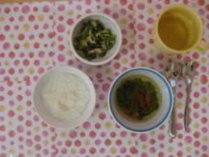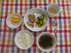 今日の給食のメニューは、ご飯、コンソメスープ(小松菜・トマト)、鶏ささみのゆかりチーズ焼き、