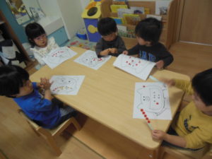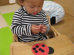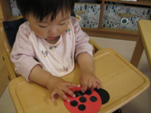タンバリン組は絵のかいてある台紙に色や大きさ、形の違うシールを貼る遊びをしました😊