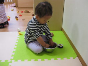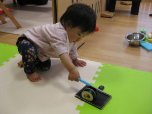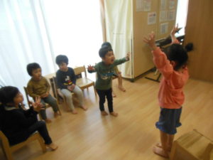 スズ組は大好きなままごと遊びと製作でシールをして、CDの曲に合わせて手遊びを楽しみました♬