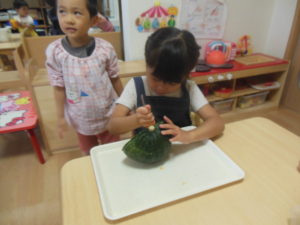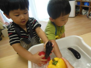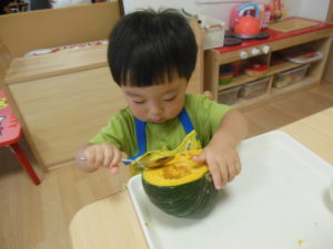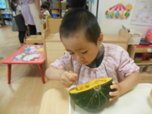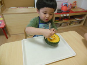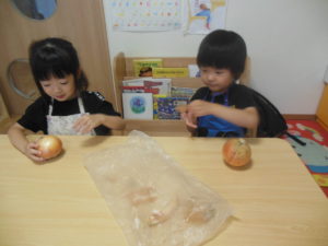 大きくて立派な野菜をゴシゴシ洗い、玉ねぎは皮をむき、かぼちゃは種をとります。