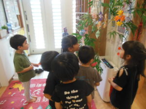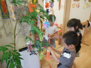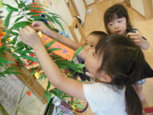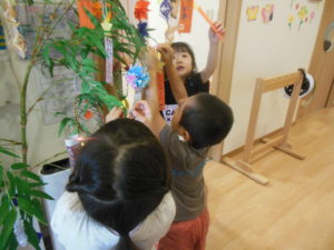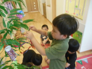 短冊の願い事を笹に飾り、願いが叶いますように・・・