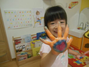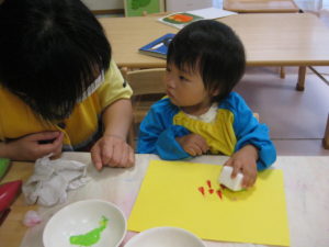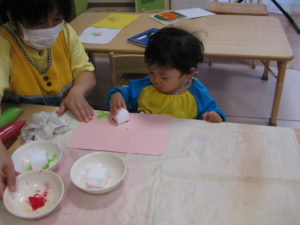 ピアノ組さんはスポンジで手形スタンプをしました。