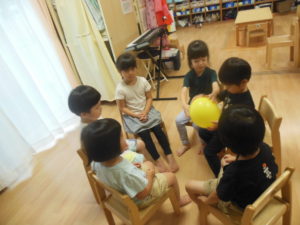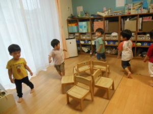 音楽が止まると嬉しそうに「きゃー」と叫び椅子に座っていました。