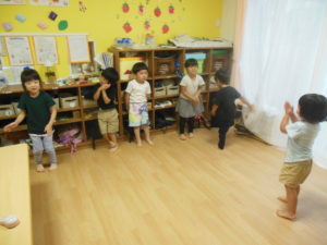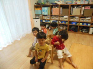 タンバリン組さんはダンスを踊った後に、椅子取りゲームの真似をして遊びました。