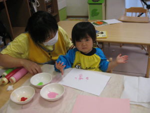 3色の色を使いスポンジで上手に押して紙に色を付けていました☆